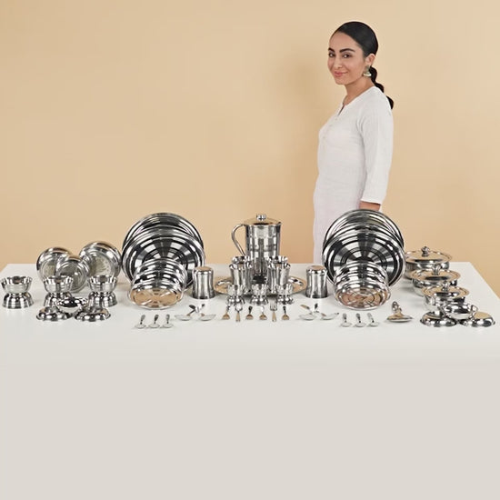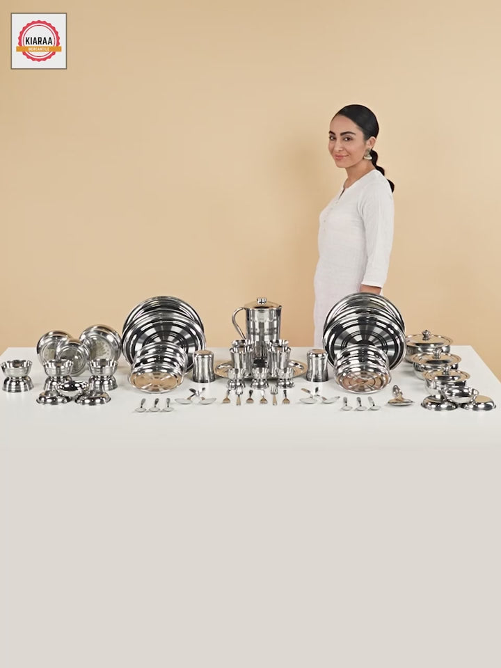 6 Dinner Plates - 11.5", 6 Quarter Plate - 7.5", 6 Vegetable Bowls(katori) - 6" (200 ml), 6 Dish Bowls(Halwa plate) - 5.5" (150 ml), 6 Chutney Katori - 3" (100 ml), 6 Glasses - 250 ml, 6 Spoons - 16 cm, 6 Forks - 16 cm, 4 Serving Spoons - 21 cm, 3 Donga With Lid - 9" (650 ml), 3 Puri Dabba - 7"-9" (250 ml, 500 ml, 750 ml), 1 Jug (1500 ml), 1 Rice Spoon - 23 cm, 1 Rice Plate - 30 cm.